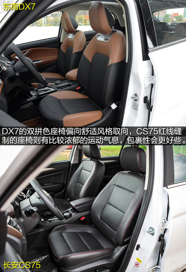 座椅方面,東南DX7同樣是雙拼色的皮質(zhì)裝飾,座椅厚實偏向舒適性的取向。長安CS75的座椅則采用了紅線縫制,運動氣息濃郁,同時包裹性方面也比DX7要稍好,偏向運動化的感覺。