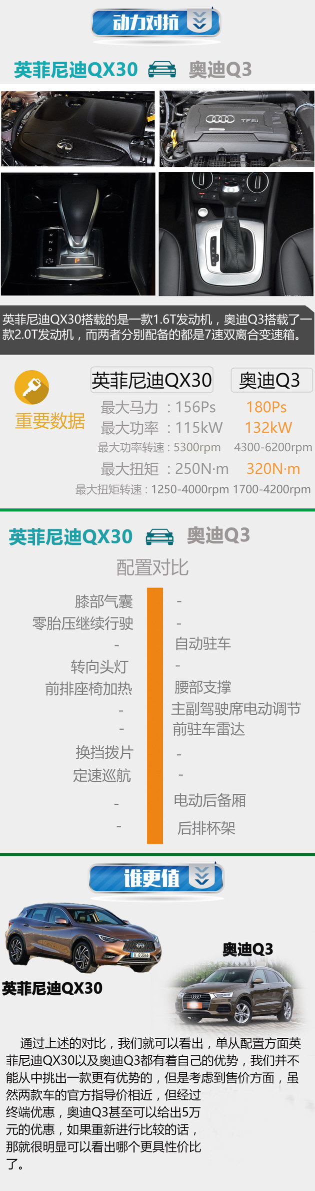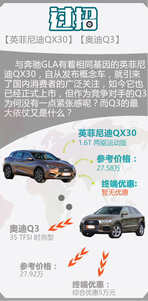 【SUV中國網(wǎng)】與奔馳GLA有著相同基因的英菲尼迪QX30,自從發(fā)布概念車,就引來了國內(nèi)消費(fèi)者的廣泛關(guān)注,如今它也已經(jīng)正式上市,但作為競爭對(duì)手的Q3為何沒有一點(diǎn)緊張感呢?而Q3的最大依仗又是什么?