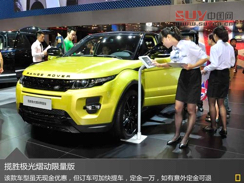 路虎SUV算得上是絕對的豪華品牌車了。鑒于路虎SUV推出了非常多的個性化定制,所以很難在價格上做出一個總體的優惠幅度的描述,很多款車型都會根據自身的裝配來實行不同的優惠政策。拿這款攬勝極光熠動限量版來說,這款車雖然在現金方面沒有優惠,但是在成都車展期間訂車只需交訂金一萬元,如有意外還可以退還訂金。此外現場訂車的客戶還可以縮短提車等待時間,更快地滿足車主的路虎夢。