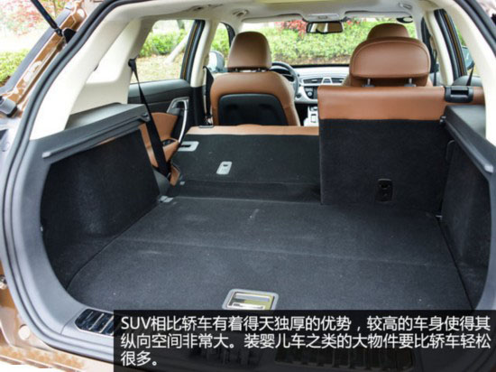 SUV相比轎車有著得天獨厚的優勢,較高的車身使得其縱向空間非常大。裝嬰兒車之類的大物件要比轎車輕松很多。同時座椅高度也比轎車更高,所以駕駛時不會感覺太蜷著。