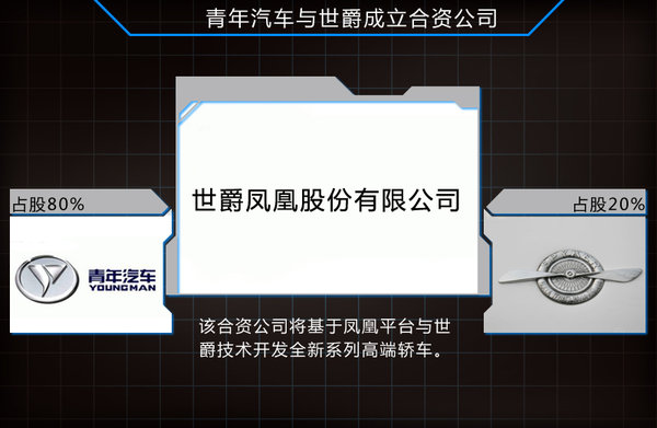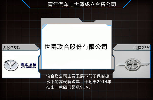 成功收購世爵后,青年汽車加強與世爵合作,成立兩家合資公司。一家合資公司名為世爵聯合股份有限公司,青年汽車出資2500萬歐元占該公司75%的股份,該合資公司主要發展不低于保時捷水平的高端轎跑車,計劃于2014年推出一款四門超級SUV。青年汽車與世爵成立第二個合資公司是世爵鳳凰股份有限公司,世爵鳳凰股份有限公司將基于鳳凰平臺與世爵技術開發全新系列的高端轎車,同時世爵鳳凰的產品可以在歐洲和中國進行制造。