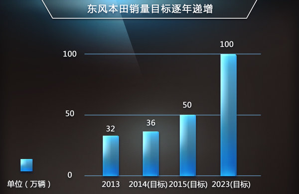 東風本田在去年成立十周年之際,正式發布了名為“挑戰1+”的中期事業計劃,規劃2023年前成為年產銷100萬、累計1000萬客戶的企業。2013年,東風本田銷量同比增長14%,全年達成321,440輛,創下企業成立十年來的最好成績,連續兩年實現10%以上的增長。今年上半年,東風本田從139384輛同比提升23.3%至171860輛。隨著SUV車型的逐漸增多,東風本田將在2015年迎來爆發,產銷目標將躍升至50萬輛。