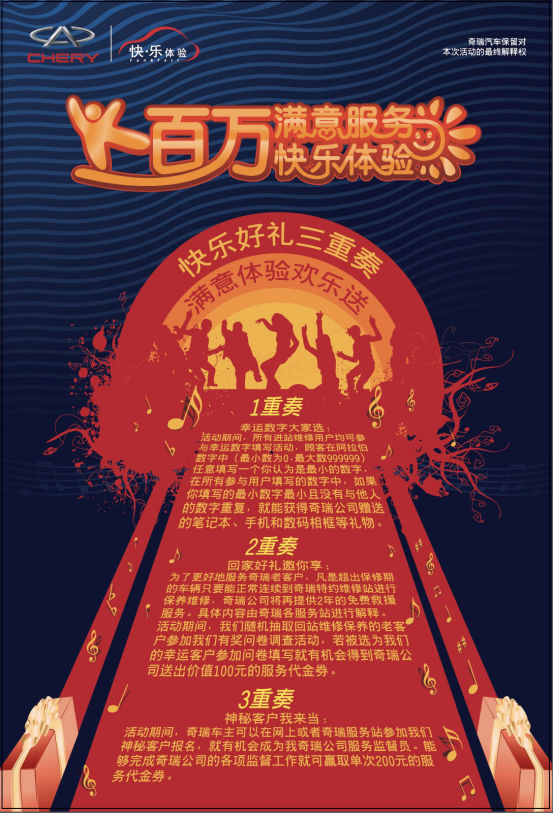 將“快樂”帶到每一位消費者的身邊。隨著奇瑞服務的不斷發展成熟,2009年,奇瑞隆重推出“百萬滿意服務,百萬快樂體驗”大型服務活動,以“三重大禮”回饋奇瑞百萬用戶。
