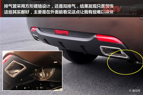 兩款車型的尾部部分還都保留了越野車的一份硬朗,略顯方正的設計是區別于其他城市SUV的一處比較明顯的特點,不過兩車的尾燈卻給了我們明顯不同的感覺,海馬S7的燈眉上挑,一幅猙獰的臉孔,而哈弗H6則和藹了不少。海馬S7的鍍鉻雙排氣管看起來真顯檔次,但是你要是趴下來一看,就會發現這其實純粹是裝飾。