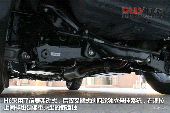 哈弗H6一改之前哈弗系列車型的非承載式車身,采用了城市SUV慣用的承載式車身。同時,哈弗H6的獨立懸掛也能更好的吸收路面的顛簸,方向盤及變速箱等位置的反饋力度也更輕,總體感覺更加柔和,基本符合城市SUV強調舒適性的特點。哈弗H6四驅版車型采用博格華納的TOD四驅系統,通過收集車輛信息判斷是否打滑或轉向,通過分動器傳遞出大小可控的扭矩,從而實現兩驅與四驅模式的合理轉化,保證0-100%扭矩連續可變傳遞。