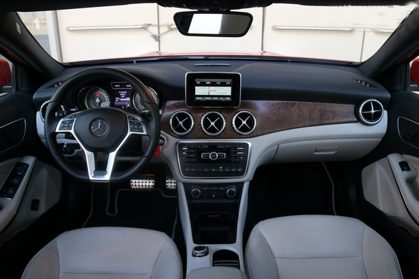 奔馳GLA級的內飾風格也與A級相似,并有木紋中控臺面板和銀色中控臺面板可供選擇。懸浮式液晶屏依然是傳統的COMAND系統界面,操作旋鈕有金屬感。三副室真皮方向盤握感細膩舒適,多功能按鍵可控制藍牙、多媒體系統、行車電腦等。雙炮筒式儀表造型中規中矩,黑底白字易于讀取信息。