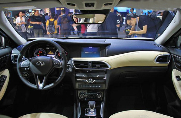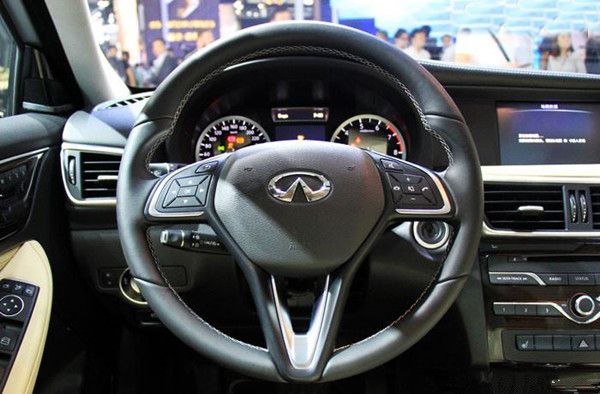 內飾方面與外觀形成了呼應,大量的線條的運用使新車層次感十足。采用三幅式多功能方向盤,仔細端詳過后,新車方向盤的造型與奔馳很像。儀表盤方面采用雙圓形的設計,配色為黑底白色。中控臺方面采用了英菲尼迪家族式雙屏的設計,整體看上去科技感十足。該屏幕集成了英菲尼迪InTouch系統。