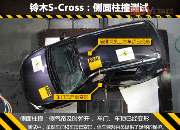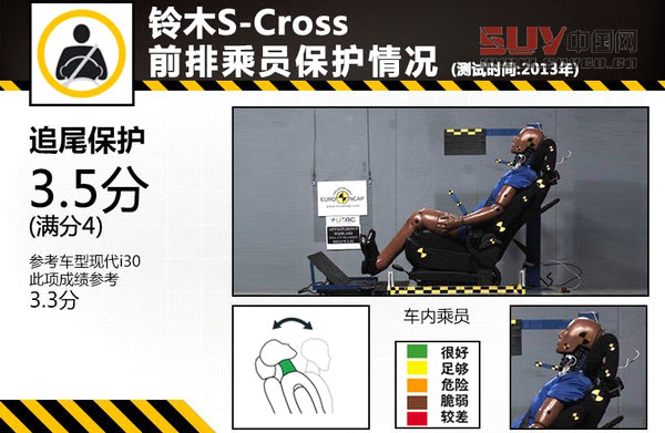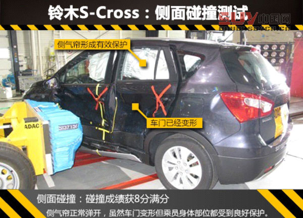 側面碰撞測試被分為側撞和柱撞兩種不同的測試方式,鈴木S-Cross在側撞時側氣簾及時彈開,雖然車門經撞擊后已變形,但車內乘員身體的所有部位都受到良好的保護,新車側撞取得滿分8分的良好成績,現代i30則為7.7分。在更為嚴苛的柱撞測試中,雖然在經過撞擊后前排乘員上方車頂已經明顯變形并且車門已嚴重變形,但側氣簾對乘員頭部的保護還是充分的,車輛對乘員身體的其他部位也提供了足夠的保護。柱撞滿分為8分,S-Cross和i30的成績分別為7.6分和5.9分。在追尾保護方面,鈴木S-Cross的座椅和頭枕可以在追尾碰撞事故時為乘員提供良好的保護,避免頸椎過度屈伸的損傷 。