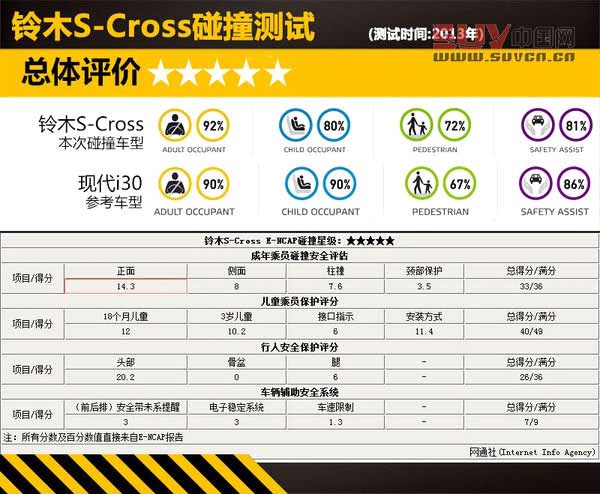 鈴木S-Cross的最終評定碰撞星級為最高的5星,從總成績來看,新車與同樣達到5星標準的現代i30不分軒輊。在乘員安全、行人安全和車輛輔助安全三項上S-Cross得分略高于i30,在兒童安全測試上i30則比S-Cross略勝一籌。值得關注的是在行人安全測試中,鈴木S-Cross的行人骨盆保護項測試成績為0分,新車對行人安全的保護還有待提升。