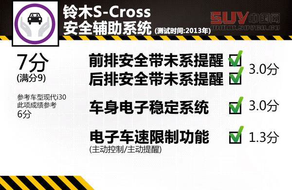 在車輛的輔助安全技術評估環節中,車速限制、ESP車身穩定系統以及安全帶未系提示都是其評估項目,每項裝配技術都將決定最終分值的高低。鈴木S-Cross的上述4項安全輔助系統都是標準配置。此項測試滿分為9分,S-Cross的成績為7分,比現代i30的成績高出1分。