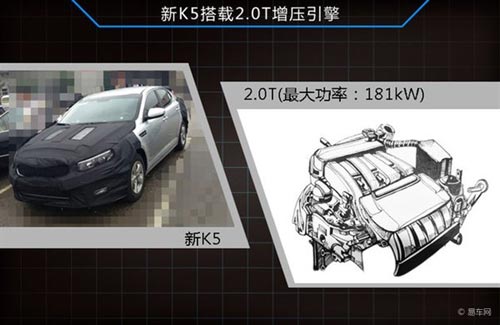 新K5動力方面除沿用現款2.0L和2.4L自然吸氣式發動機之外,還將新增一款搭載的是2.0T渦輪增壓引擎版本,該2.0T最大功率為181kW,最大扭矩為350Nm,相比2.4L引擎在性能上有了很大提升,與競爭對手帕薩特、邁騰等德系車型所搭載的2.0T發動機相比,無論是最大功率還是最大扭矩均完全超越對手,有明顯優勢。