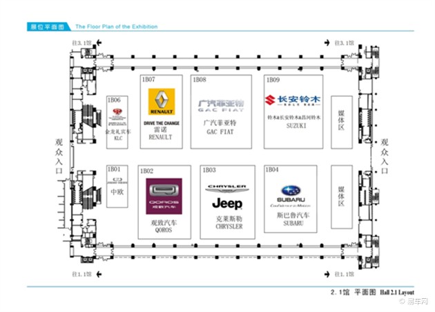 2.1館主要包括:雷諾、廣汽菲亞特、長安鈴木、觀致、克萊斯勒 JEEP、斯巴魯品牌