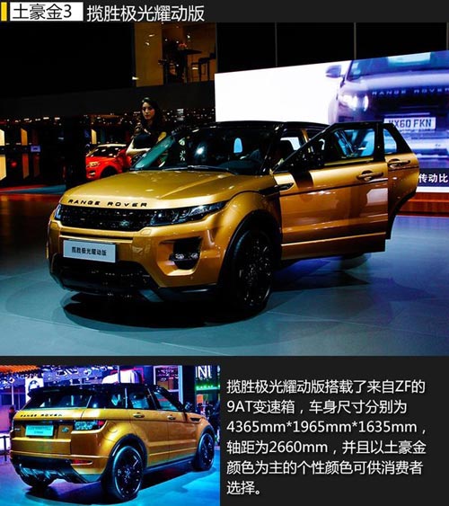 攬勝極光耀動版搭載了來自ZF的9AT變速箱,車身尺寸分別為4365mm*1965mm*1635mm,軸距為2660mm,并且以土豪金顏色為主的個性顏色可供消費者選擇。
