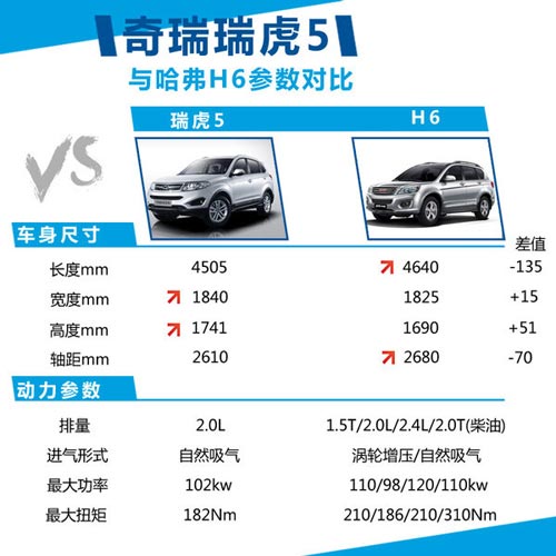 瑞虎5采用iAUTO均衡智造技術(shù)平臺打造,其車身尺寸分別為:4505/1840/1741mm,軸距為2610mm,同級別車型哈弗H6身尺寸分別為4640/1825/1690mm,軸距為2680mm,單從尺寸數(shù)據(jù)來看二者各有優(yōu)勢,但瑞虎5在配置上擁有無鑰匙進入/啟動、倒車影像、倒車雷達、GPS導航、DVD影音娛樂系統(tǒng)、四門一鍵式升降門窗、電動調(diào)節(jié)座椅、電動防夾天窗、BOSCH9.0版本ESP、HHC坡道輔助系統(tǒng),在同級別車型中優(yōu)勢較為明顯,新車上市后將競爭對手直接鎖定在了哈弗H6車型上。