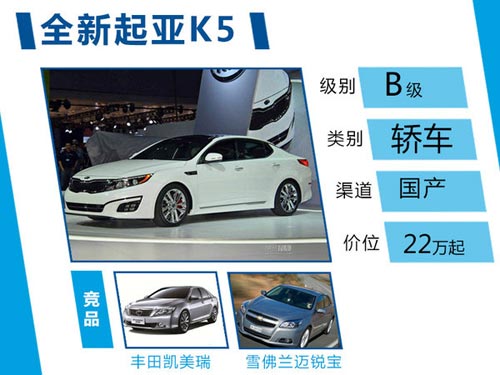 2013年12月5日,東風悅達起亞全新K5將在南京金陵會議中心正式上市。屆時,東風悅達起亞總經理蘇南永、東風悅達起亞副總經理林鐘憲和中國知名男演員吳秀波等將蒞臨現場,共同見證這款中級轎車的上市盛典。起亞全新K5此次在原有2.0L和2.4L發動機的基礎上,新增2.0T發動機,預計售價22萬起。