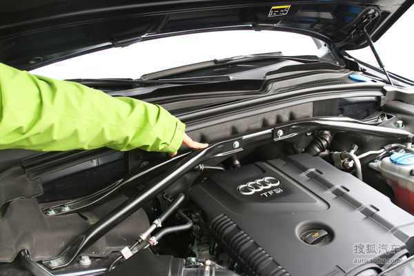 分析:兩車發動機蓋均采用了液壓支桿,并且都裝配了較為厚實的發動機隔音棉,達到了同級別應有的標準,不過奧迪Q5則更為實在,在發動機艙內裝配了平衡支桿,使整車穩定性更加出眾。