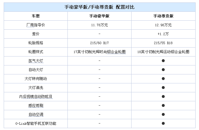 增加9千元,手動精英版的配置水平一下子提升了不少。不僅配備上了關系到行車安全的車身穩定系統和前排側氣囊,而且像定速巡航、多功能方向盤和行車電腦顯示等增加行車便利配置上也增加不少。另外還配備了皮質座椅和電動天窗等舒適性配置,外觀上也有小幅提升。這樣看來,加9千塊錢買手動精英版是個挺不錯的選擇。