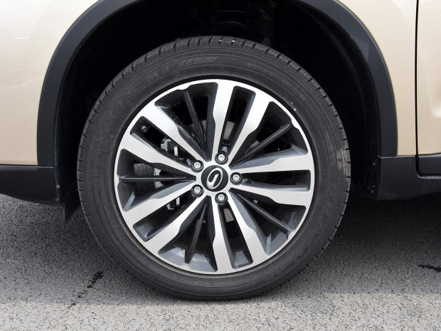 首先我們可以看到,手動精英版車型在外觀上就比舒適版有所提升——換裝了17英寸切削光輝時尚鋁合金輪圈,加裝了行李架,看起來更加精致一些。