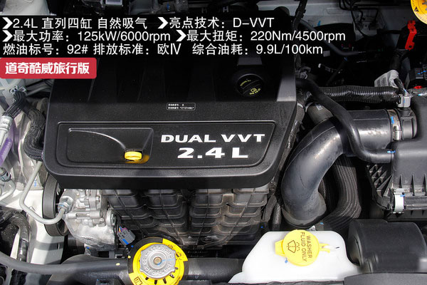 酷威提供了兩種排量的動力組合,一臺經濟性更為出色的2.4升D-VVT直列四缸發動機以及一臺配備3.6升Pentastar V6發動機,最大功率分別為125kW和206kW,最大扭矩分別為220Nm和342Nm。不過四驅系統只配備在3.6升的車型上,2.4升的車型僅僅是前驅的車型。