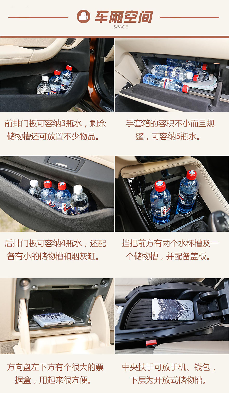 全新X1的儲物空間很值得稱贊,豐富+大,常規的儲物槽都做的很大,使用起來方便且人性化,中央扶手下方還有個開放式儲物槽,放置放錢包之類的東西拿取很方便,門板的儲物槽除了水杯架還設計了小物件的儲物格,處處可以體現設計師的用心。