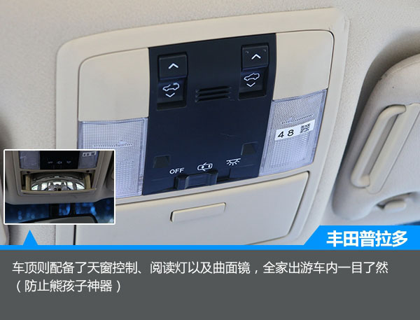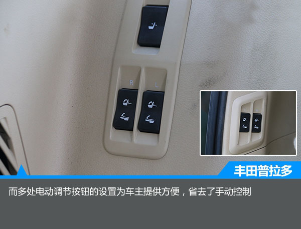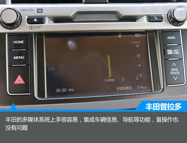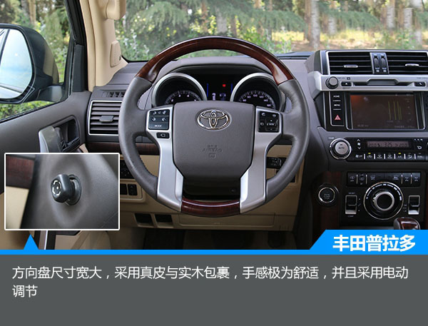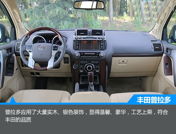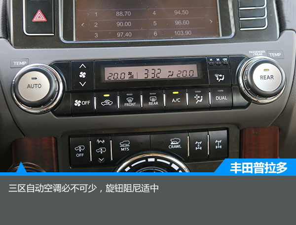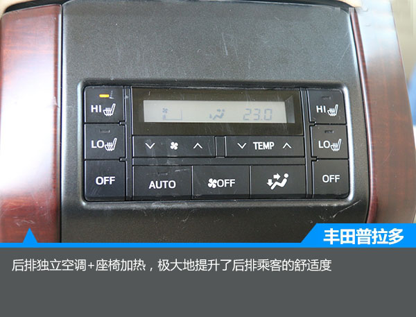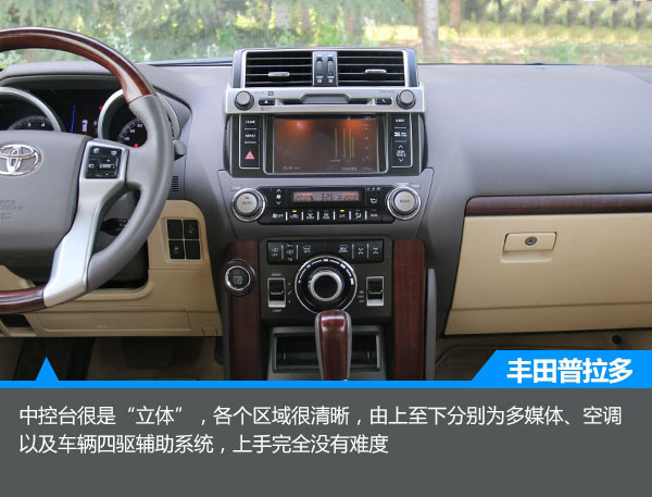 拉開車門,普拉多采用了上深下淺的內飾設計,并且中控臺極具科技感。大面積實木裝飾并不會感到老氣橫秋,反而會給人以“踏實”的感覺,這也正是普拉多想要表達的。中控臺采用了近似方形的設計,由上至下分別為多媒體、空調以及越野性能操作,各個按鍵清晰明了,上手完全沒有難度。與此同時,該車儀表臺也是十分強大,不僅可以顯示常規的油耗信息,包括車輛狀態甚至輪胎偏轉角度都能顯示,這對在非鋪裝路面上飛奔的普拉多來說非常重要。此外,該車也沒有忘記照顧后排乘客,不僅自動空調與座椅加熱都有配備,車頂還配備了多媒體系統,使得出門旅行更加舒服。