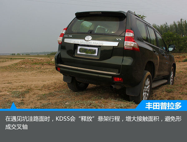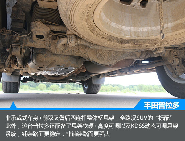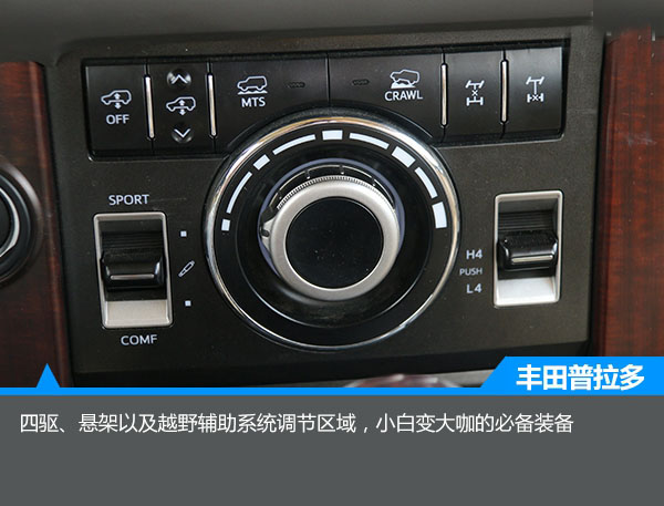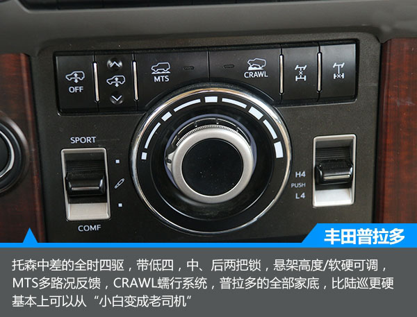 相比較其他車型,普拉多可謂武裝到了牙齒,憑借著兩大法寶KDSS(動態可調懸架)與CRAWL(低速蠕行),即便是小白,也能成為大咖(如果沒有經過訓練而去越野是相當危險的一件事,高手都是車技+意識兼備)。在越野行駛時,KDSS系統放任懸架伸展,更長的懸架行程確保輪胎與地面接觸,有效地提升了穩定性與公路性,畢竟交叉軸這種不利于脫困的情況是每一個越野人都不愿意碰到的。