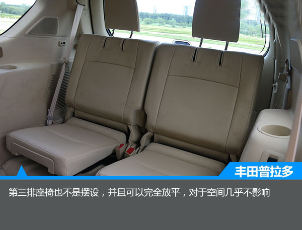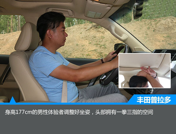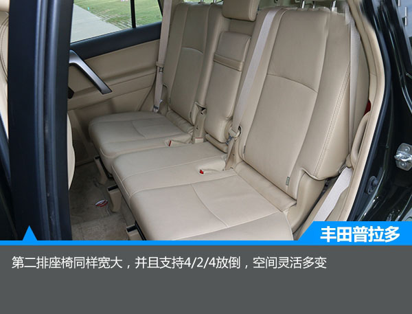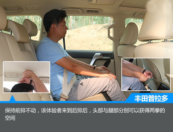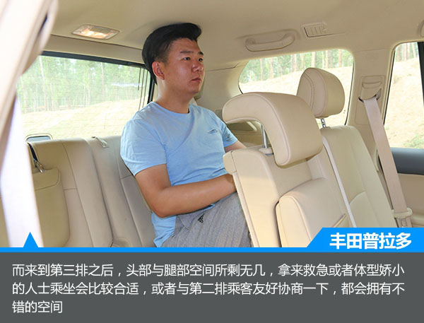 定位于中大型全路況SUV的普拉多擁有4780*1885*1845mm的車身尺寸,而軸距則達到了2790mm,配備了第三排座椅的普拉多空間上還是有保障的。身高177cm的男性體驗者調整好坐姿,頭部擁有一拳三指的空間。保持前排不動,該體驗者來到后排后,頭部與腿部分別可以獲得兩拳的空間。而來到第三排之后,頭部與腿部空間所剩無幾,拿來救急或者體型嬌小的人士乘坐會比較合適。此外,普拉多還提供了大量的儲物空間,并且備胎也采用底盤懸吊的方式,對于車內空間有不小的貢獻。
