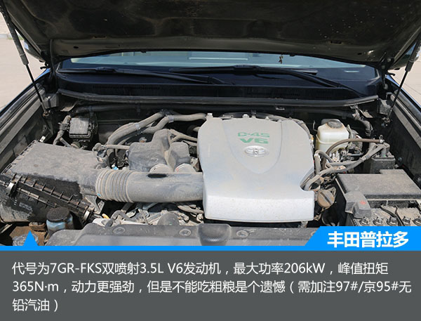 動力方面,此次普拉多最大的改變莫過于搭載了全新代號為7GR-FKS的雙噴射3.5L V6發動機,該引擎具有缸內直噴與傳統電噴兩種噴油方式,其擁有206kW的最大功率,同時可輸出365N·m的峰值扭矩,與該引擎匹配的是一臺6速手自一體變速箱。此外,作為全路況SUV的王者,普拉多不僅采用了非承載式車身,搭配前雙叉臂后多連桿整體橋懸架,還配備了以托森為中央差速器的全時四驅系統,并且還有低速四驅,其低速擋傳動比為2.566:1。而兩把鎖在試駕車型上也是標配,普拉多的脫困以及越野能力毋庸置疑。