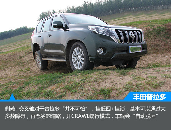 在面對各種障礙的時候,這臺普拉多還是非常穩定的,此時需要克服的是心里的恐懼感。如果遇到比較棘手的問題,掛到低速四驅模式(此時電子穩定程序是關閉的),再鎖上中、后兩把鎖,這臺普拉多會進入最強狀態,一般的障礙完全難不倒它,只需要控制好油門與剎車,脫困比較容易。