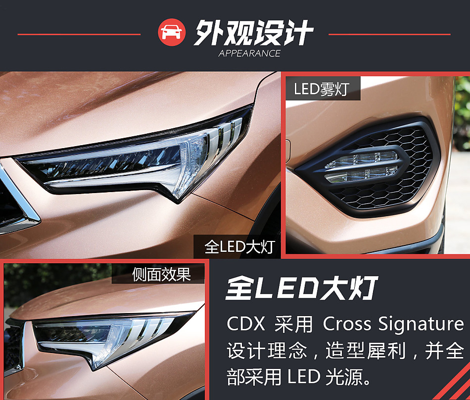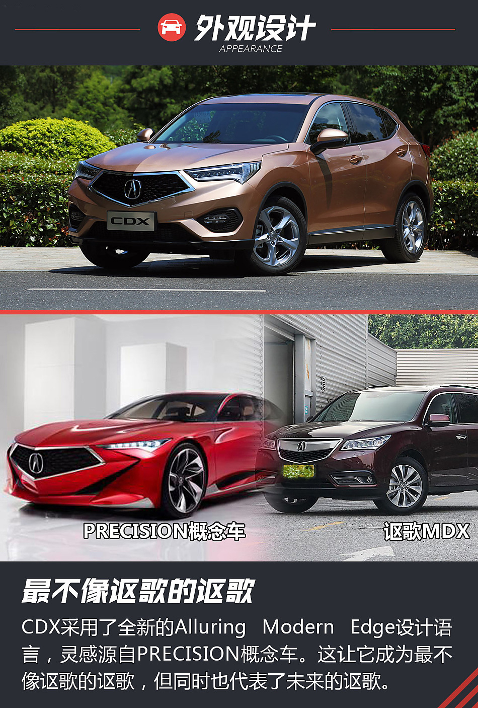 廣汽謳歌CDX采用了謳歌全新的“Alluring Modern Edge”設計理念,其中不少元素都和此前在北美車展亮相的PRECISION概念車相似。設計風格比較前衛(wèi)、極致,符合其面對年輕精英消費群體的市場定位。