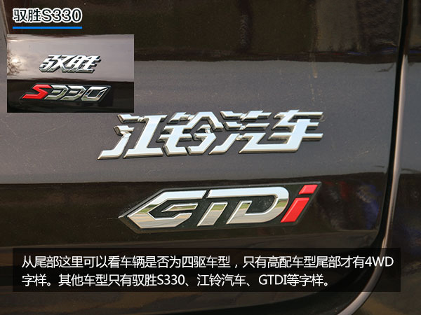 從尾部這里可以看車輛是否為四驅車型,只有高配車型尾部才有4WD字樣。其他車型只有馭勝S330、江鈴汽車、GTDI等字樣。