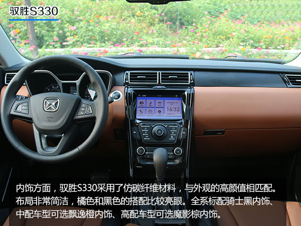 內飾方面,馭勝S330采用了仿碳纖維材料,與外觀的高顏值相匹配。布局非常簡潔,橘色和黑色的搭配比較亮眼。全系標配騎士黑內飾、中配車型可選飄逸橙內飾、高配車型可選魔影棕內飾。