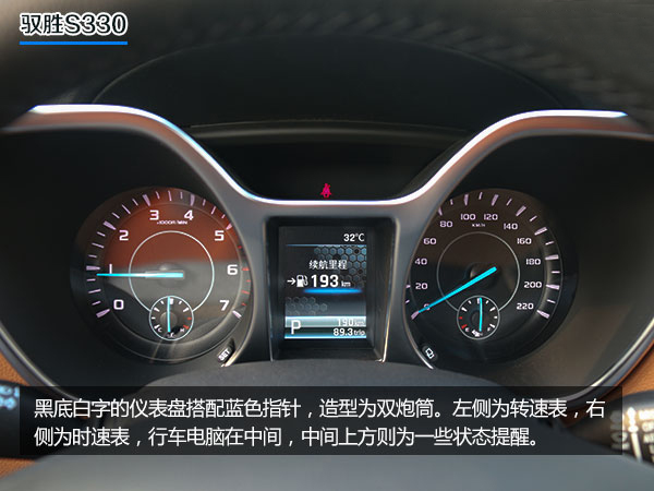 黑底白字的儀表盤搭配藍色指針,造型為雙炮筒。左側為轉速表,右側為時速表,行車電腦在中間,中間上方則為一些狀態提醒。