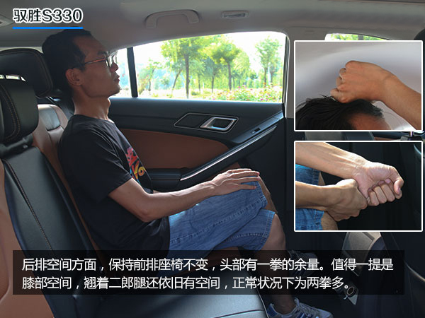 后排空間方面,保持前排座椅不變,頭部有一拳的余量。值得一提是膝部空間,翹著二郎腿還依舊有空間,正常狀況下為兩拳多。