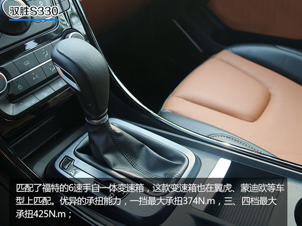 馭勝S330搭載的1.5 L GTDi渦輪增壓汽油發動機,最大輸出功率為120KW,峰值扭矩為250N·m。擁有渦輪增壓,缸內直噴,雙連續可變氣門正時三大先進技術,高效低耗。并匹配了福特的6速手自一體變速箱,這款變速箱也在翼虎、蒙迪歐等車型上匹配。