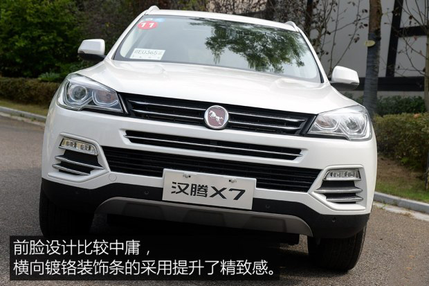 漢騰X7作為漢騰汽車的首款車型,自然肩負著打開品牌知名度的重要使命。這款車被定位為緊湊型SUV,它的車身尺寸達到了4671*1902*1697mm,軸距為2810mm。該車采用了時尚年輕化的外觀設計風格,外觀線條硬朗,前臉原創度比較高。楔形前大燈組采用LED光源和氙氣透鏡大燈搭配的方式,霧燈也采用了LED光源。前進氣格柵、前保險杠等處加入鍍鉻裝飾條,提升了前臉的精致度。