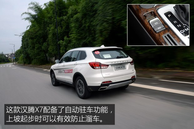 在道路試駕過程中有一小段山路,因為有很多社會車輛,秉著安全的原則,所以車隊的整體速度并不快。在這過程中,我還是嘗試著將變速箱切換到了手動模式。其實一般的家用雙離合變速箱換擋速度并不快,而且在靜止上坡的一瞬間,還容易出現短暫溜車的現象,好在這款漢騰X7配備了自動駐車功能,在右腳離開剎車踏板的時候,可以有效防止溜車,這個功能對于生活在非平原地區的車主來說,非常實用。