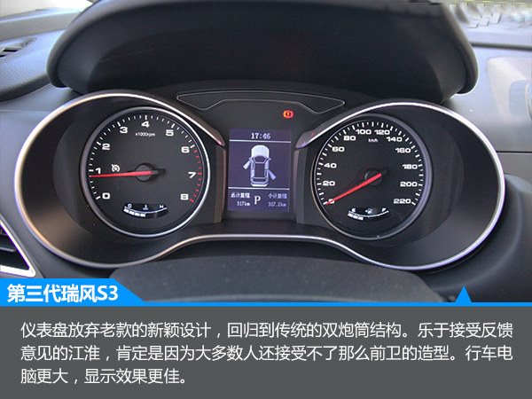 坐進駕駛艙內,你會感覺到升級后的內飾幾乎看不到原來老款車的影子,本次升級把內部的質感、品質都提升了一個檔次。大面積的軟性材質,接縫處采用紅色細線縫合。中控大屏營造了很強的科技氛圍,尺寸為8英寸,可以觸屏操作。良好的分層設計,就算物理按鍵多,也并不影響美觀,按鍵阻尼舒適度不錯。儀表盤回歸傳統的雙炮筒,行車電腦尺寸變大。這種質的“進化”使瑞風S3內部更加逼近合資車型。