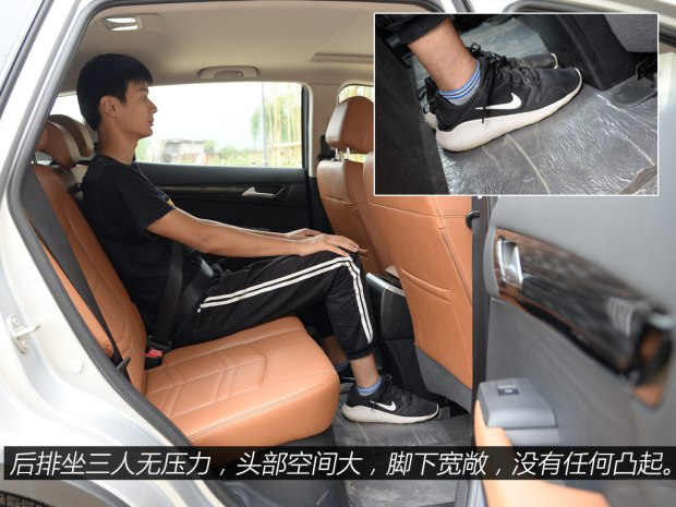 身高180cm的體驗者在前排頭部空間超過一拳,在后排腿部空間也達到了兩拳,頭部同樣不憋屈,保持了一拳多的空間。更可貴的是后排中間地板基本沒有凸起,而且非常寬敞。