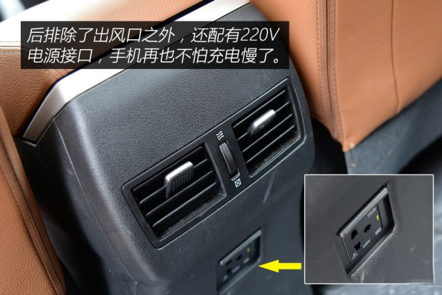 首先是全系標配ESC車身穩定系統,主動安全配置的全系搭載很厚道,值得肯定。其次是后排帶有出風口和220V電源接口,可以為大多隨身設備進行充電,現在看來非常方便,比如可以直接插上充電器給手機充電,充電效率遠超過USB接口。