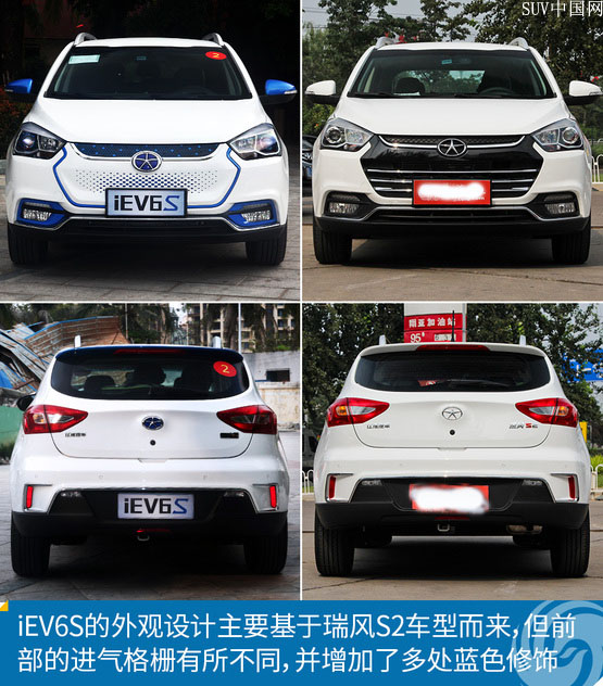 坦率的說,基于瑞風S2造型設計而來的iEV6S確實挺漂亮,這也是大多數人第一眼看到實車的感受,相比于汽油機車型,iEV6S的最大不同在于前臉的改進,帶有濃厚中國風的“寶瓶口”式格柵造型、遍布車身的藍色裝飾件等等,在突出純電動車型的同時,也為新車增加了更多個性化時尚符號,整體效果不錯,讓iEV6S更有“眼緣兒”。