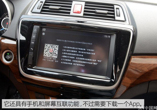 9英寸觸摸屏的配備讓整個中控面板更加簡潔,從實際體驗來看,它的反應(yīng)雖然不算特別流暢,但沒有卡頓現(xiàn)象,表現(xiàn)可以接受。如果要實現(xiàn)手機互聯(lián)功能,則需大家掃描二維碼,下載專屬客戶端應(yīng)用后,通過藍牙和USB線連接,進行實現(xiàn)該功能。