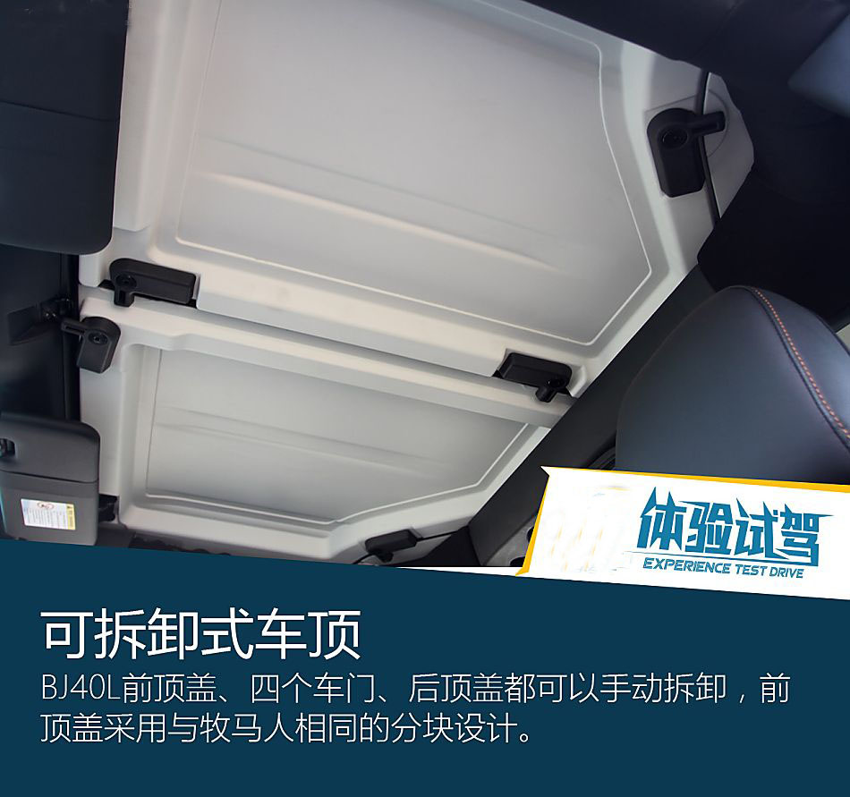 相比BJ80的老成穩重,BJ40L在可玩性上要強不少,比方這可拆卸的車頂就有各種“拆”的玩法。