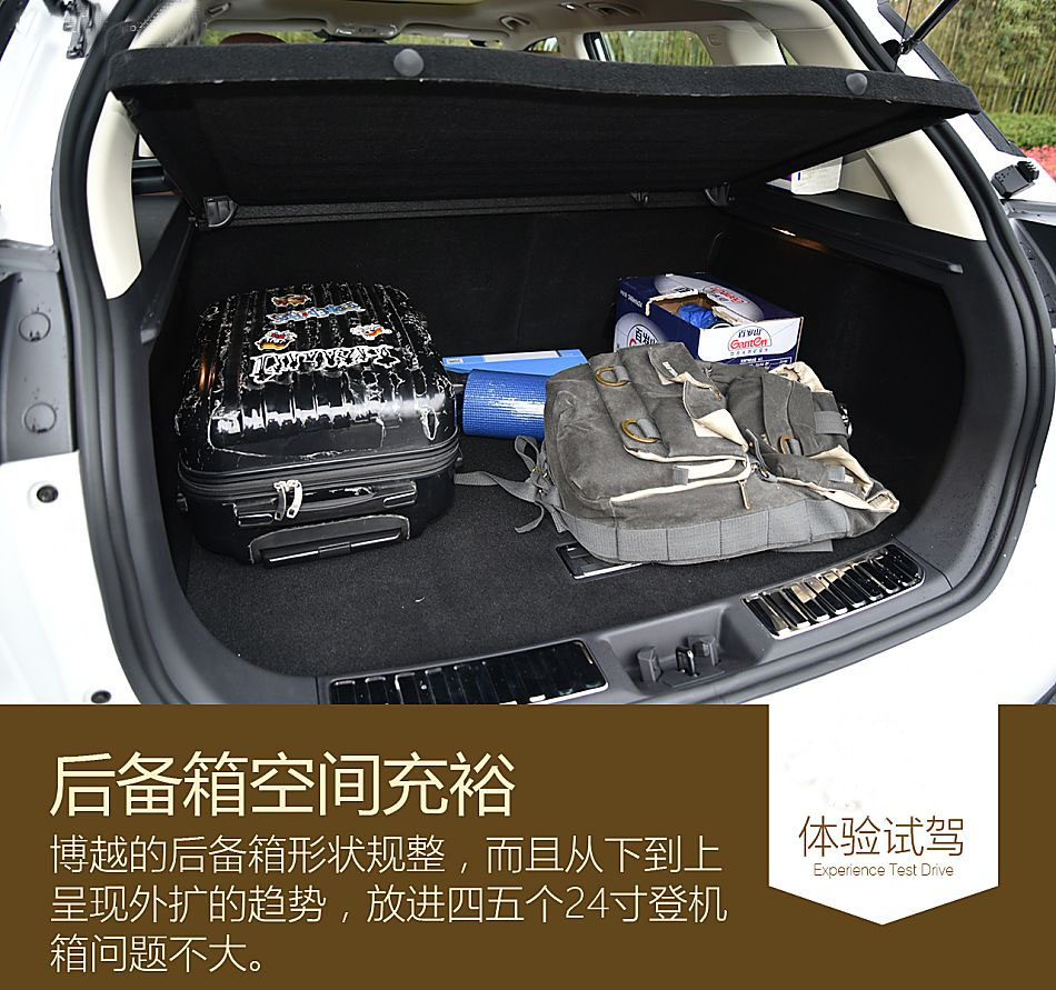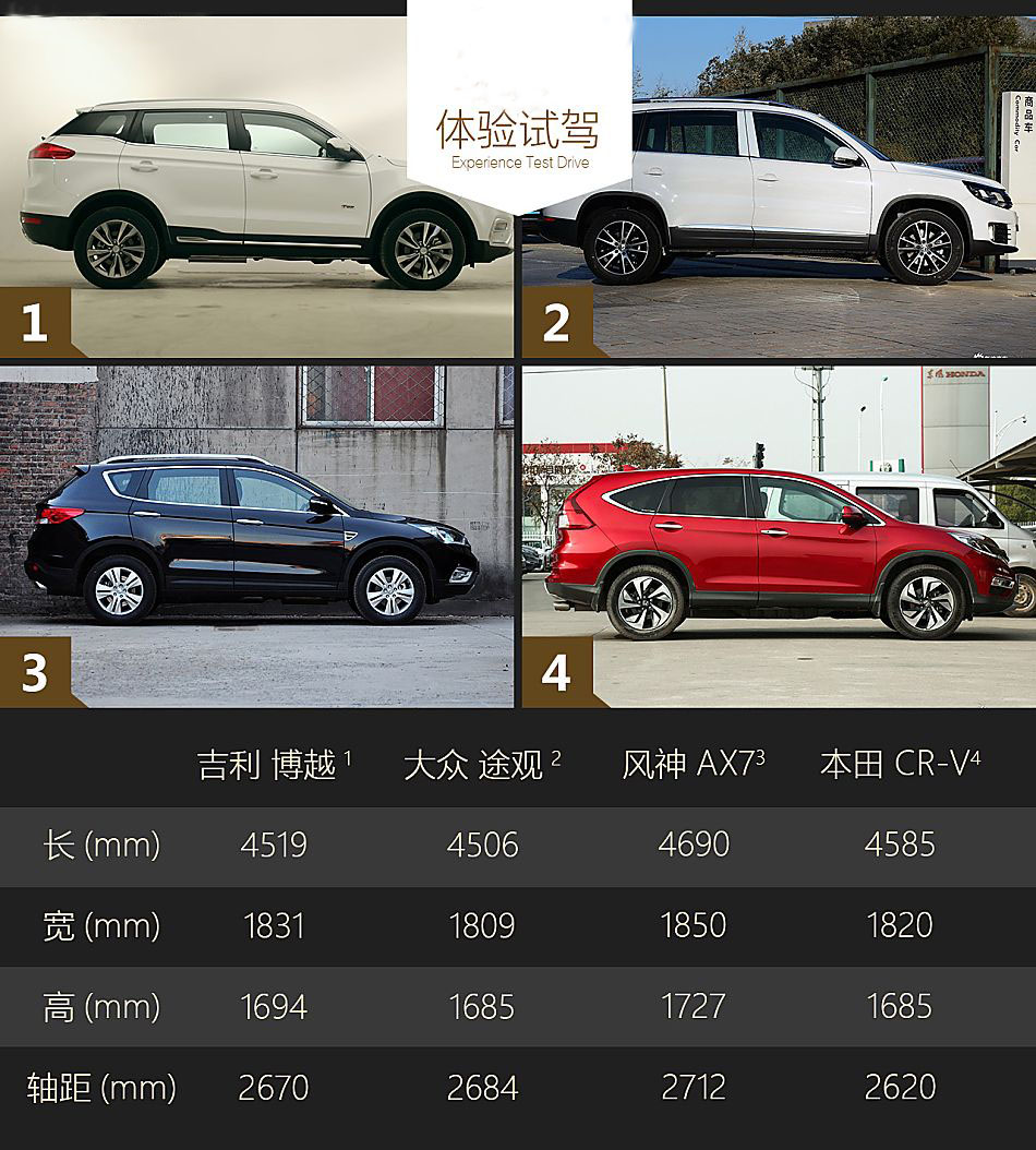吉利的工作人員告訴我,博越在研發(fā)期間的對(duì)標(biāo)車型為大眾途觀。通過對(duì)比軸距我們發(fā)現(xiàn),博越的軸距處于緊湊型SUV的中游水準(zhǔn),但一個(gè)軸距不能明顯反映出實(shí)際的空間,因?yàn)閷?shí)際體驗(yàn)后我們發(fā)現(xiàn)博越的后排腿部空間實(shí)際上要比途觀還略強(qiáng)一些。