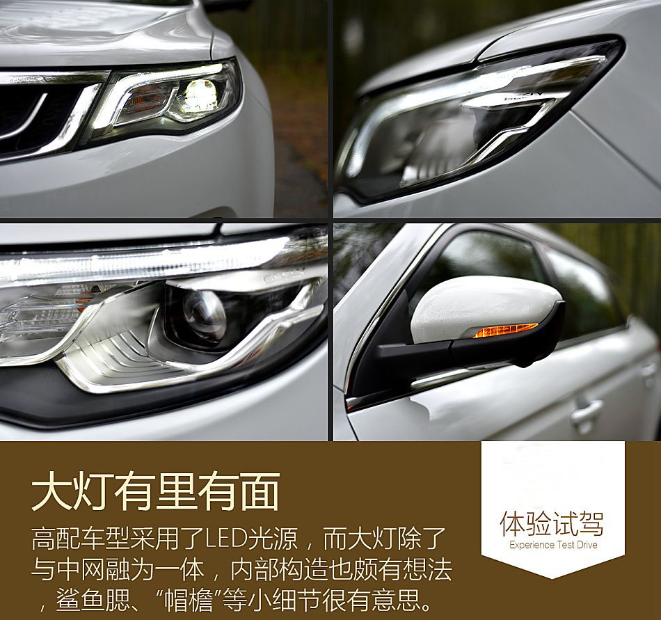 我們?cè)囻{的這臺(tái)車為1.8TD自動(dòng)智尊型。博越的中、高配車型采用了遠(yuǎn)近光LED大燈,低配車型為鹵素光源。