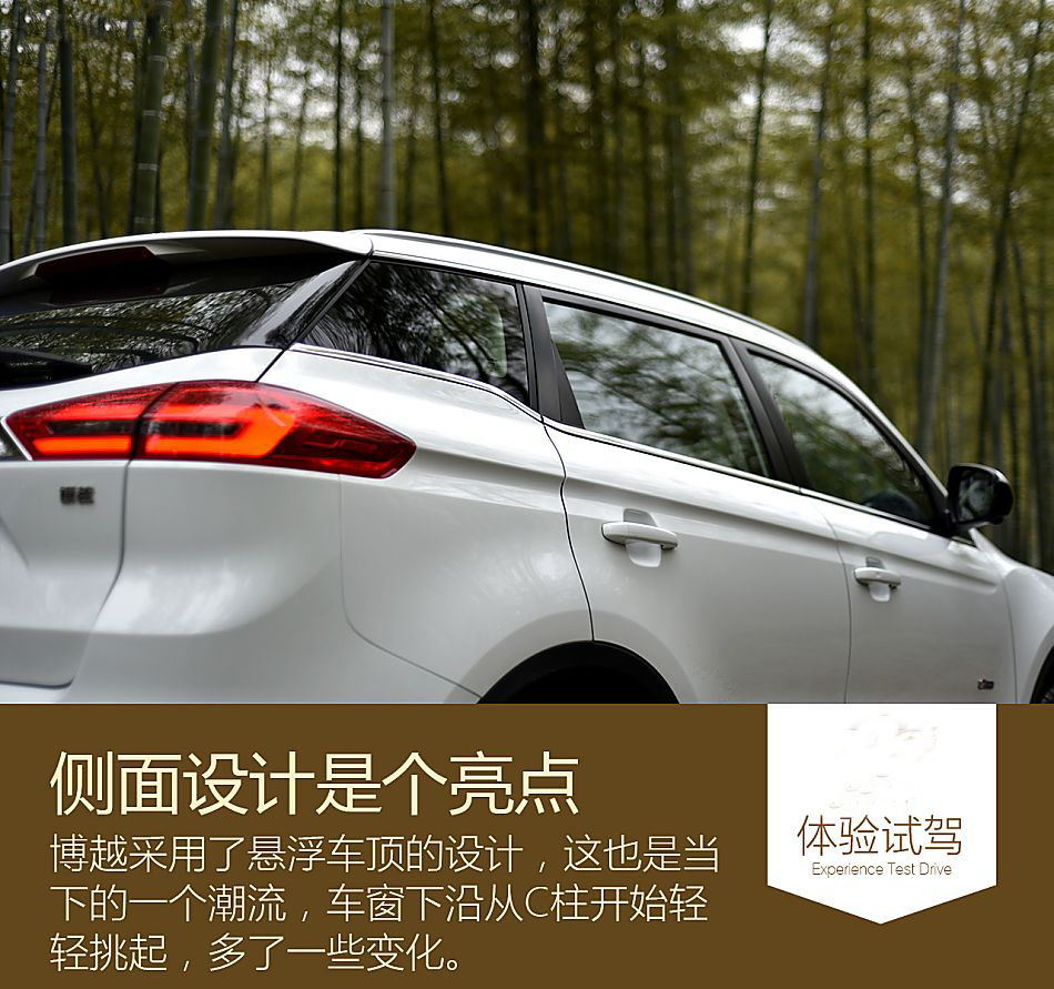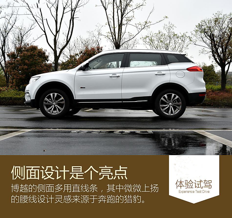 側(cè)面是博越外觀的一大亮點(diǎn),微微上揚(yáng)的腰線給這款車帶來了一定的俯沖感。