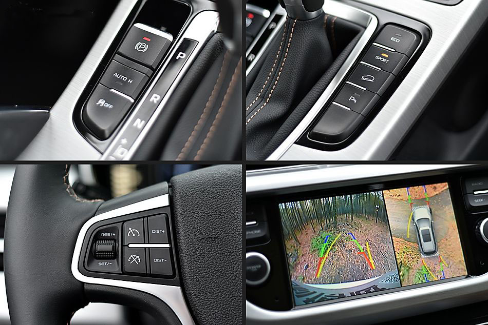 我們?cè)囻{的這款是兩驅(qū)頂配,配置與四驅(qū)頂配相當(dāng),搭載了前后雷達(dá)、陡坡緩降、車道偏離預(yù)警、ACC自適應(yīng)巡航、360°全景3D影像、ECO/SPORT駕駛模式選擇等功能,而AUTO HOLD自動(dòng)駐車則是全系標(biāo)配。