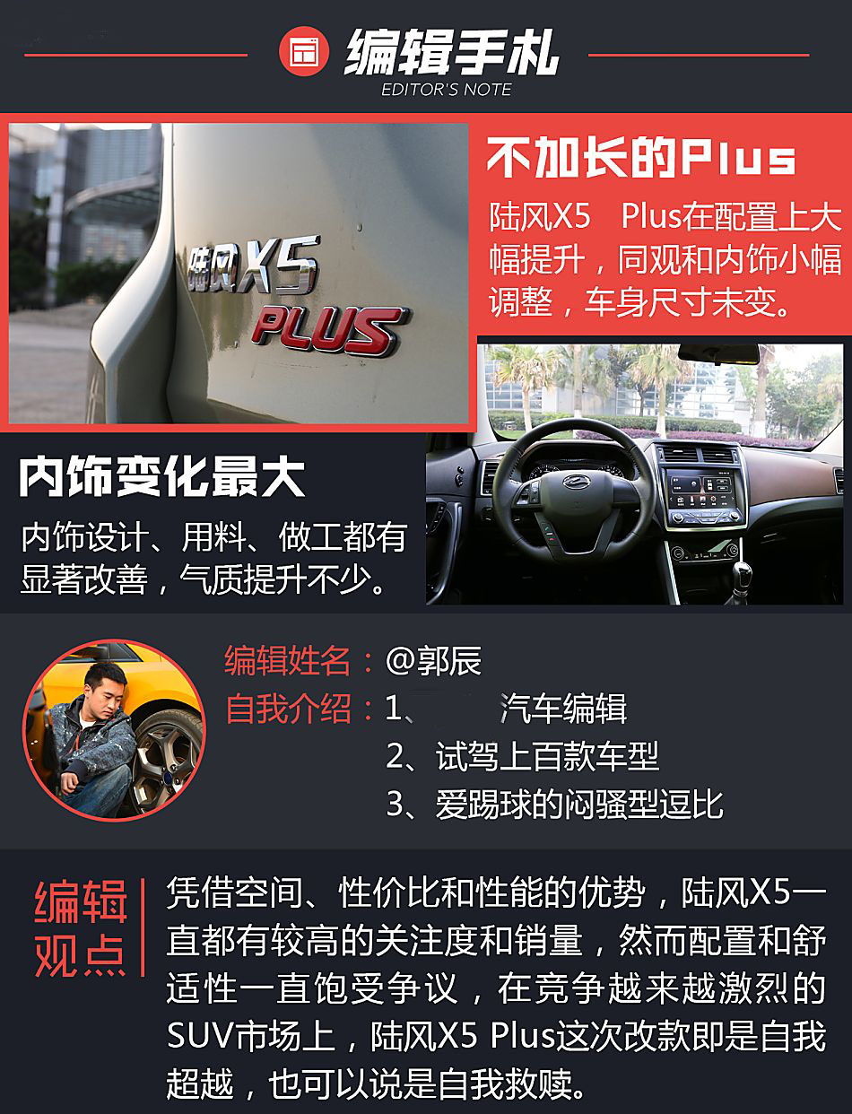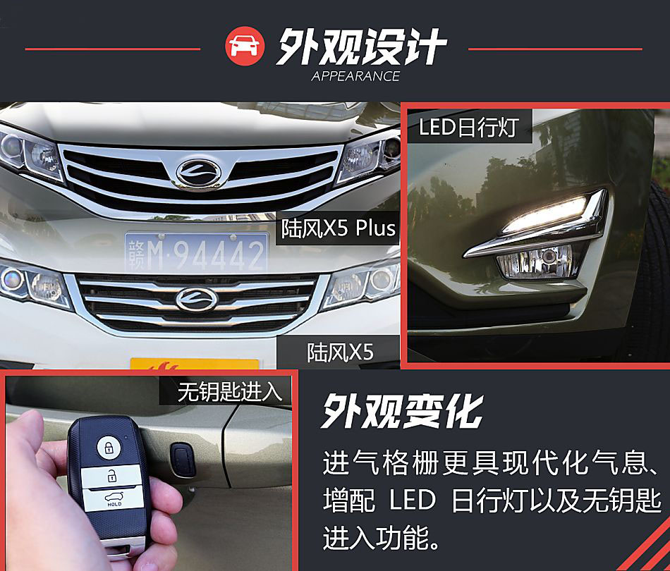 總結(jié):陸風(fēng)X5 Plus這次改款并沒有什么大動作,動力、車身尺寸都沒變,外觀也只是稍微有點升級罷了。但是在內(nèi)部的升級卻是非常關(guān)鍵,效果也是立竿見影,視覺效果和舒適度都有質(zhì)的提升。而且新增加的一些配置也都非常實用,像座椅加熱、360°影像、電子手剎以及自動大燈等等功能,都是日常使用頻率非常高的配置,從這點可以看出陸風(fēng)集團非常用心。相信陸風(fēng)X5就這樣不斷地超越自己,完善自己,收獲的一天很快就會到來。