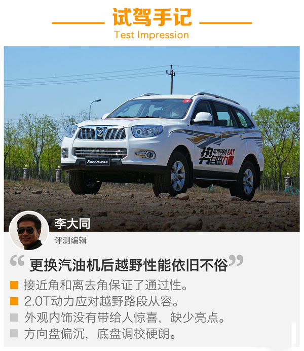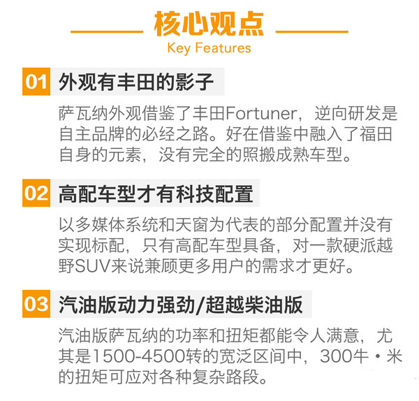 總結:總的來說,除了動力總成外,汽油版薩瓦納與柴油版沒有任何區別。從外觀和內飾來講,薩瓦納沒有帶給人太多的驚喜,工藝和用料都符合它該有的水準。功能配置以保證越野性能為主,像多媒體這種科技配置只在高配車型出現來看,薩瓦納是以硬派越野SUV為立身之本的。各項測試它也確實表現不俗,只是方向盤的沉重風格和底盤硬朗的調校對日常舒適性有一定的影響,如果能為非越野路況提供更多的舒適感和操控性就更好了。
