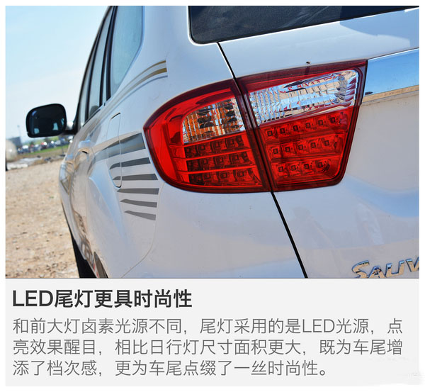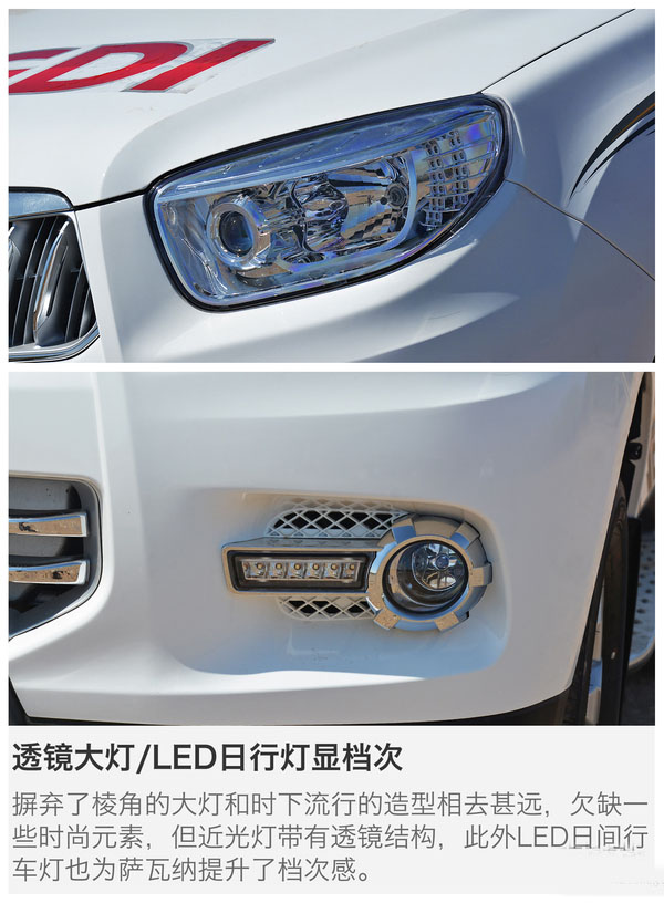 摒棄了棱角的大燈和時下流行的柳葉型、開眼角、獠牙造型相去甚遠,欠缺一些時尚元素,但近光燈帶有透鏡結構,為薩瓦納提升了檔次感。LED尾燈在外觀中最能展現時尚氣息的地方,整體造型和前大燈相呼應,盡顯低調之感。外后視鏡集成了轉向燈,造型上沒有太多亮點,表現中規中矩。